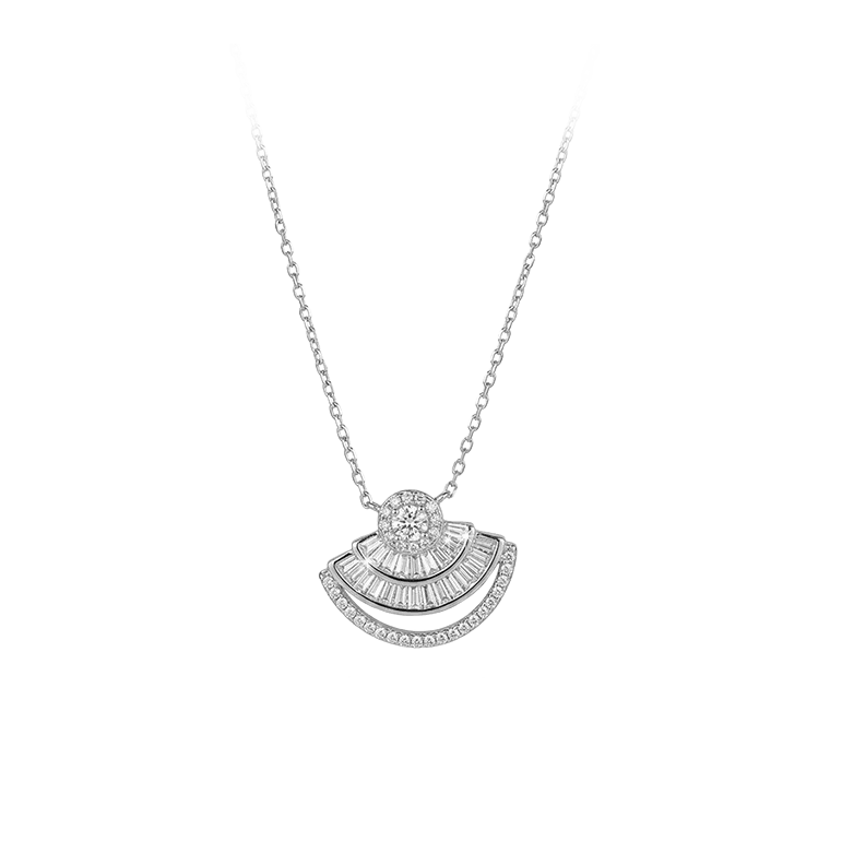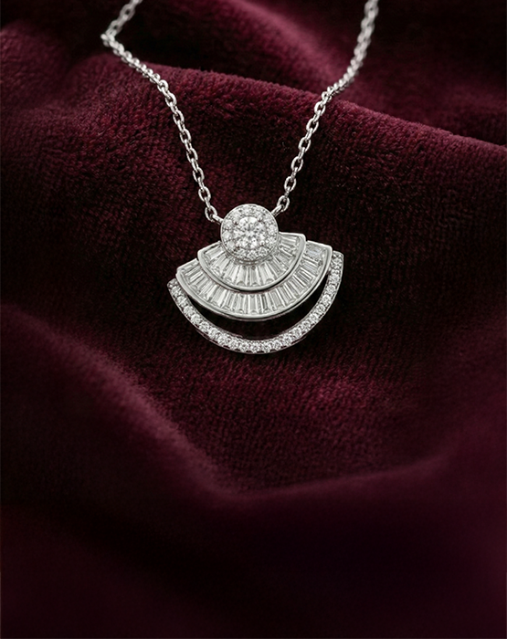 Elevate your jewelry collection with this stunning fan-shaped pendant necklace, designed to capture elegance and brilliance. The pendant showcases a dazzling round center stone surrounded by delicately arranged baguette and round stones forming a graceful...